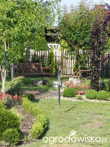 W tle -tam gdzie stoi ławka-rosną drzewka owocowe, orzech, natomiast przed ławką są brzozy oraz buk kolumnowy Dawyck Purple.