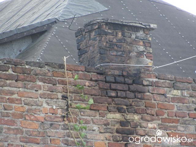 korzenie czepne bluszczu znalazły dogodne warunki i zamieniły się w korzenie właściwe, pobierające wilgoć z muru. Wrosły pomiędzy cegły i rozwaliły mur a cegły zaczęły kruszyć się i wypadać. Do wycięcia bluszczu użyto pił i siekier. Jak pokrycie dachu wygląda, to trudne do wyobrażenia