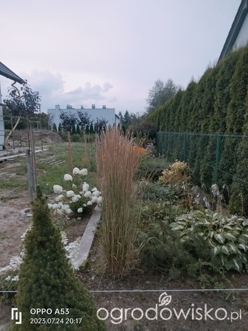 Rabatę z pisardii chciałabym zachować w tej formie jak zaplanowałam.tz.od ogrodzenia będą trawy tam gdzie teraz widać hosty, później hortensje tam gdzie teraz trzcinnik i Pisardii. Przed nimi lub między coś jeszcze może rozchodnik... myślę że odległości będą dobre
