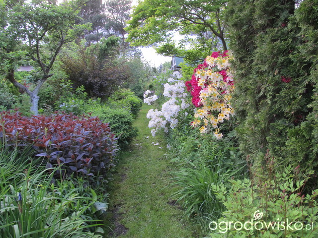 W ubiegłym roku wzięłam się za rabatę, którą widać na poniższym zdjęciu po lewej stronie - całą zarośniętą na bordowo. W maju wyglądało to pięknie, ale potem rośliny się pokładały i robił się bałagan - złościło mnie to. Poza tym pod tym bordowym dywanem, który zadusił niemal wszystkie rośliny, jakie tam kiedyś posadziłam, nie rosło już nic innego. Tylko drzewo czeremchy amerykańskiej, które postanowiłam wykarczować, gdy poczytałam o jej ekspansywności w naszej florze i kilka przygniecionych krzewów.