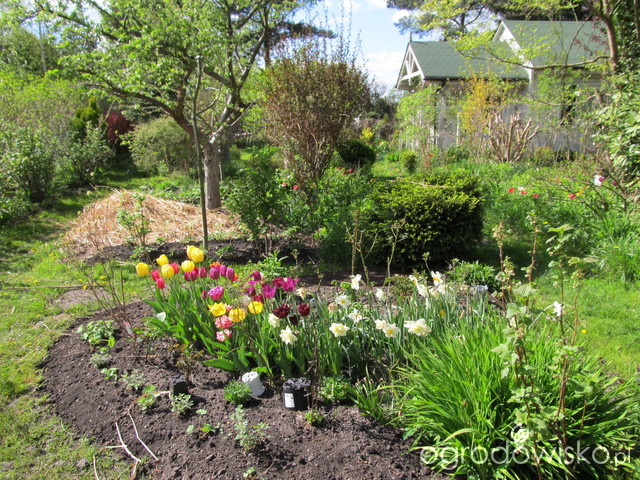 I wtedy zapowiedzieli nagle atak zimy i mróz. Pojechałam ostatniego popołudnia, by ratować co się da przed mrozem. Wówczas też wsadziłam na tym wolnym kawałku wszystkie zakupione cebule tulipanów i narcyzów, bo nie było czasu kombinować. Odmiany tulipanów były oczywiście częściowo pomylone, więc wiosną wyszedł kwiatowy patchwork, ale przynajmniej przyciągał wzrok