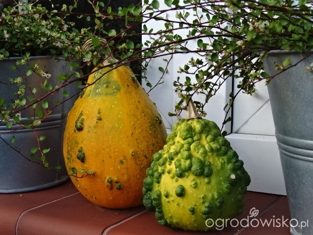 Dynie wyrosły z wyrzuconych na kompost zeszłorocznych, w sierpniu były zielone, teraz zmieniły kolor na jesienny.