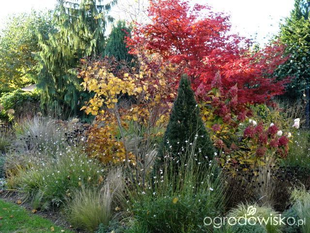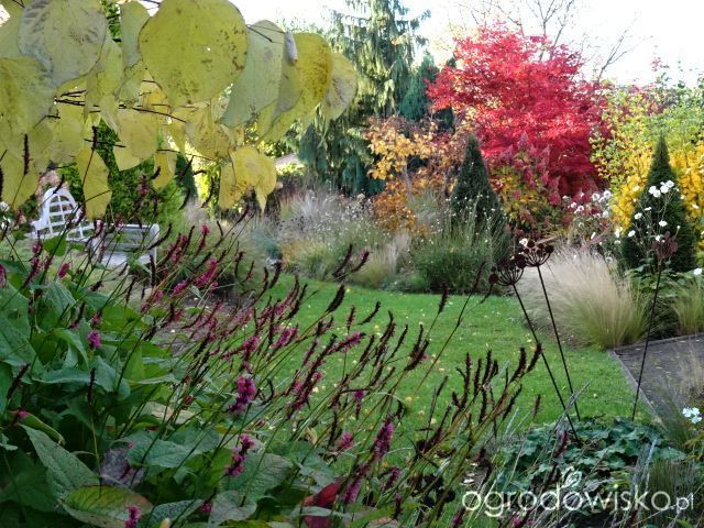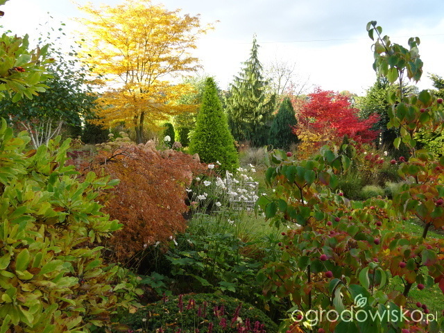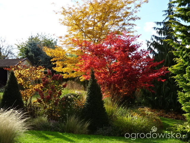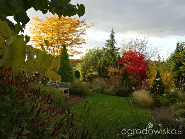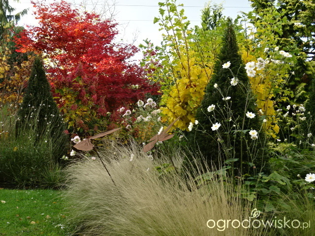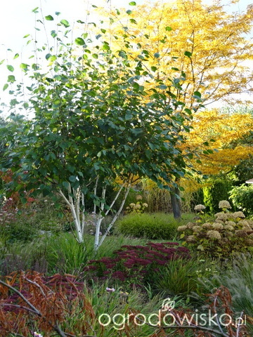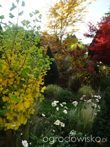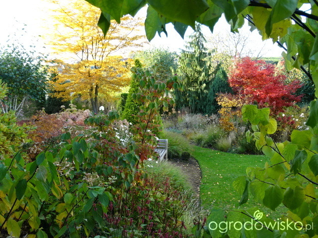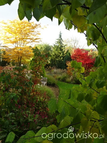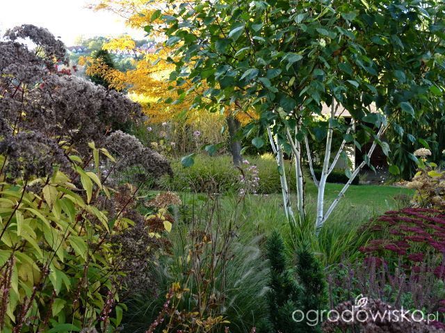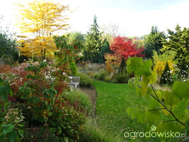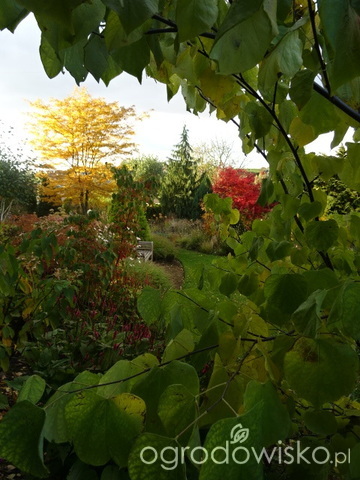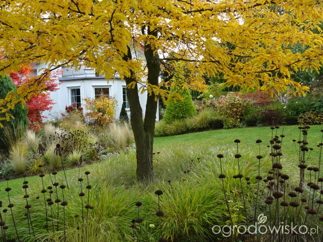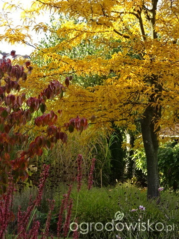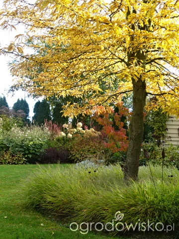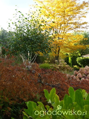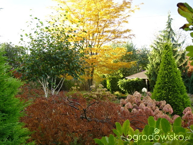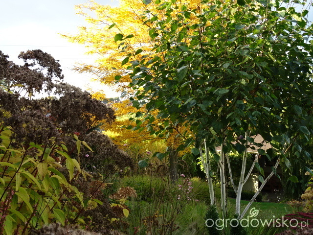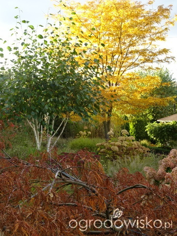 Ciekawy kontrast zielonej jeszcze brzozy z żółtą glediczją i brązem sadźca oraz klona dissectum.