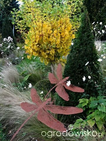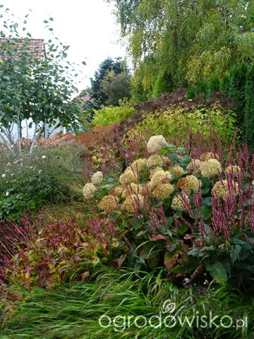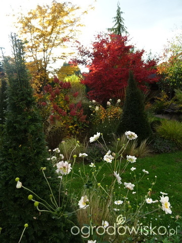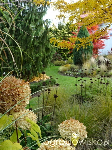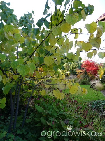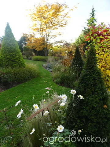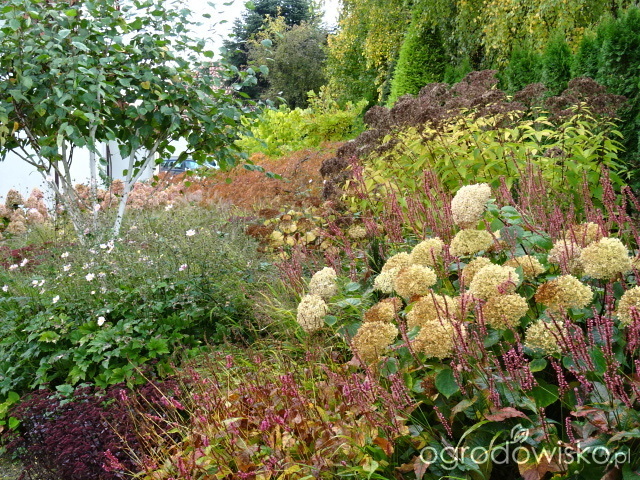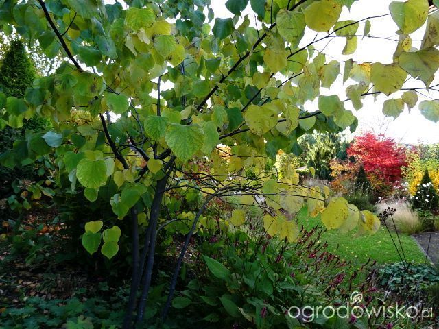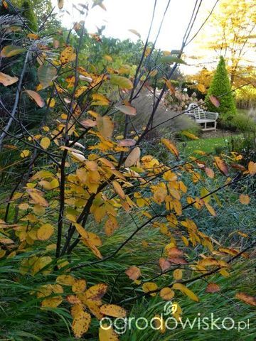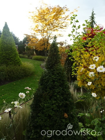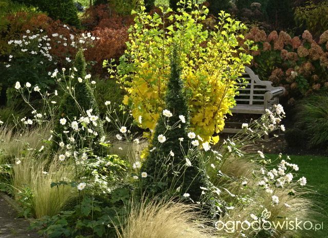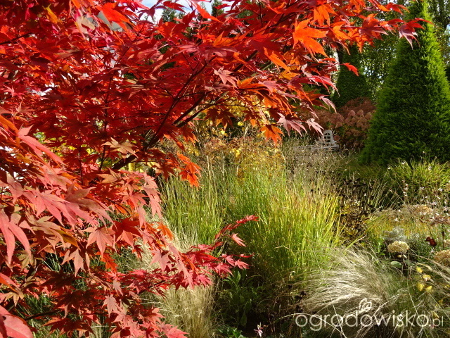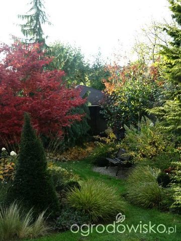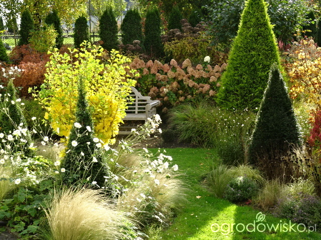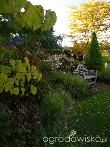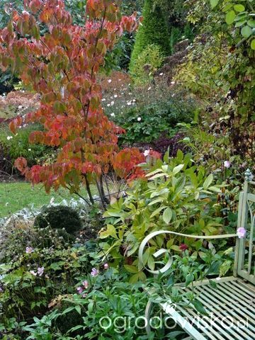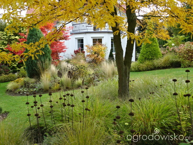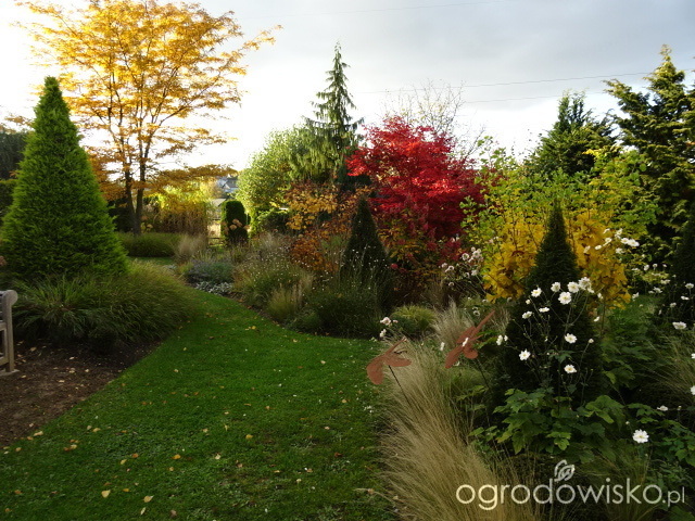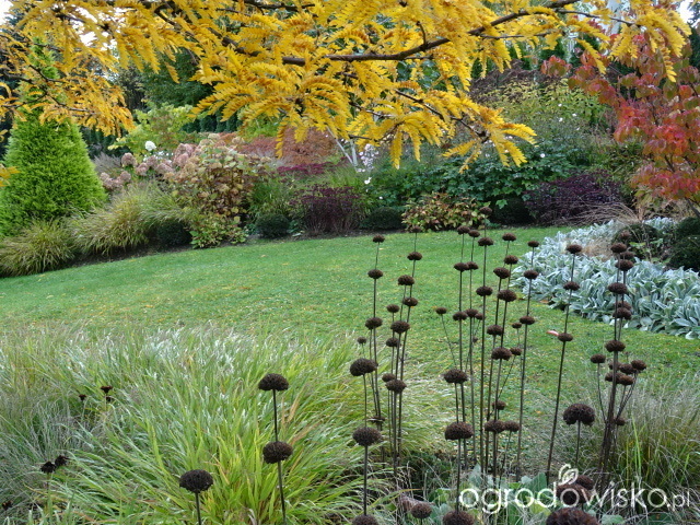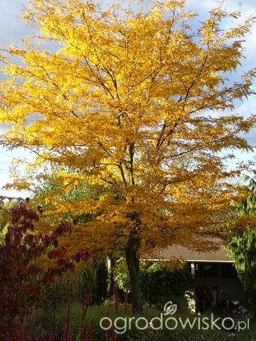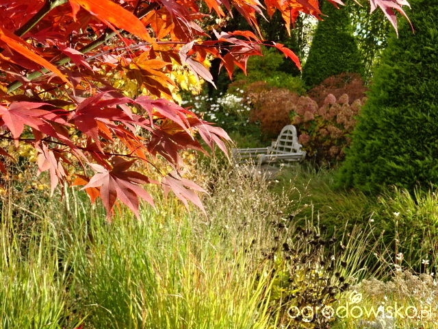 Ciekawy kontrast zielonej jeszcze brzozy z żółtą glediczją i brązem sadźca oraz klona dissectum.