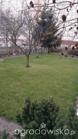 Wiosną pod drzewami było sporo suchego filcu, który dość mocno wygrabiłam i w tych miejscach pojawiła się ta mocno zielona trawa.
