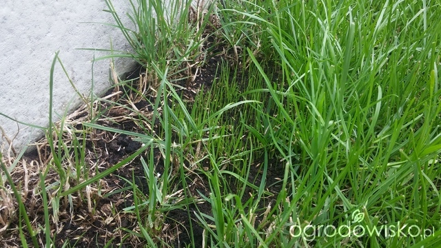 Rosnące źdźbła są soczysto zielone jednak trawa przy glebie żółknie jakby gnije.