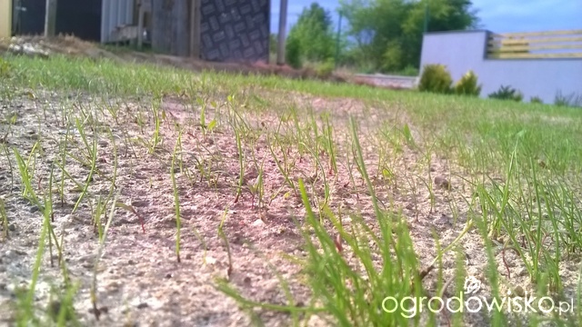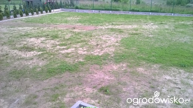 W Sierpniu 2014r kupiliśmy dom z ogródkiem w którym została ułożona trawa z rolki. Grunt z pewnością nie był odpowiednio przygotowany. Została wybrana jedynie istniejąca warstwa trawy chwastów, usunięto kamienie z ziemi. Nie podejrzewam, aby deweloper podjął jeszcze inne działania. Trawnik początkowo wyglądał bardzo ładnie szybko się ukorzenił. Trawa była mocna, gęsta i intensywnie zielona. Pod koniec marca trawnik zagrabiliśmy dwukrotnie usuwając starą trawę i rozgrabiając filc, który utworzył się w zacienionym miejscu pod płotem. Trawa utraciła swój kolor i była miejscami żółta. Następnie skosiliśmy trawę i za radą Pani w ogrodniczym, przy pomocy siewnika rozsypaliśmy nawóz firmy Target (nawóz do trawników z mikroelementami). Oczywiście intensywnie podlewaliśmy trawnik. Trawa odżyła nabierała intensywniejszego koloru. Jednak miejscami była wyblakła i wyglądała jakby usychała, a gdzie nie gdzie również zrobiły się łyse placki. W maju zauważyliśmy, że na tych łysych plackach zaczęły wzrastać nowe źdbła trawy. Liczyliśmy, że trawnik się zregeneruje. Jednak gdy dwa tygodnie temu skosiliśmy trawnik, niestety dość krótko, przeraziliśmy się. Trawnik wyglądał jakby cały zaczął usychać, wtedy też zobaczyliśmy, że było bardzo dużo suchej trawy przy samej darni. Dlatego użyliśmy ręcznego wertykulatora aby pozbyć się tego siana. Wynieśliśmy kilka koszy kosiarki suchej trawy. Miejscami trawa tak jakby odbiła, podniosła się. Niestety w wielu miejscach wyglądała jakby usychała od góry. Wczoraj zaczęłam kosić ponownie trawnik. Skosiłam tylko część, ponieważ zaczął padać deszcz. Miejsce które skosiła wygląda przerażająca. Trawa jest jakby wyschnięta, pojawiły się suche placki a źdźbła trawy znowu wyglądają jakby usychała od góry. Mamy wysyp chwastów, ostów, mleczy. Bardzo proszę o pomoc, czuję się bezradna. Mam wrażenie, że każde zabiegi z trawnikiem ostatecznie pogarszają jego wygląd. Jak pomyślę jaki był piękny w ubiegłym roku a jak wygląda teraz to chce mi się płakać. Co robić? Wklejam zdjęcia trawnika, widać dokąd trawa jest obecnie skoszona.
