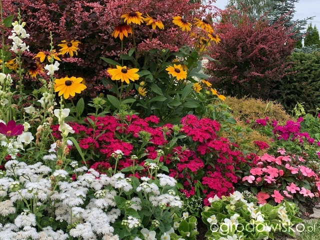 Zinnia Zesty Purple też niespotykany kolor jak na niską cynię. Te sieję już drugi raz. Tu z wysianym po raz pierwszy ageratum High Tide Blue.