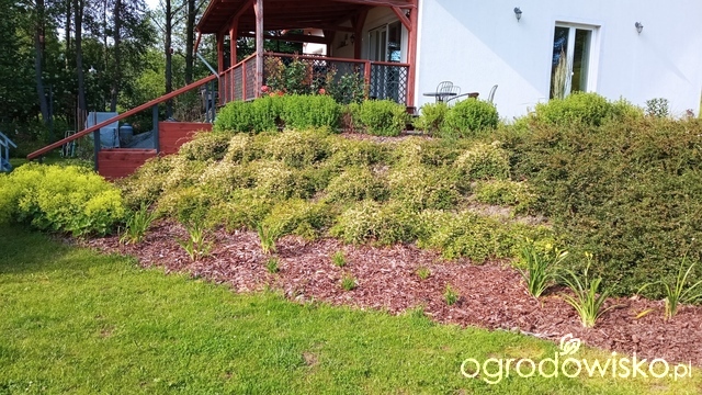 Irga i tawulec pogięty na skarpie. Irga skończyła już kwitnienie a tawulec kończy.