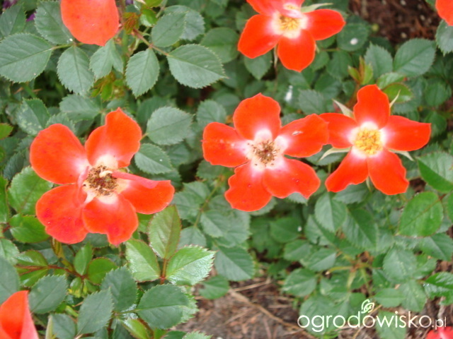 Przed laty nabyłam taką różyczkę na wystawie "Zieleń to życie". Oczywiście zapamiętanie nazwy wtedy nie było mi w głowie. Posadzona w mało korzystnym miejscu i zaniedbana w czasie mojej nieobecności jakoś przetwała. Zawsze miałam do niej sentyment. Po nawożeniu i podlewaniu w czasie suszy odwdzięcza się w tym roku długim i obfitym kwitnieniem. Może ktoś ją rozpozna? Jest niewielka (około 30 - 40 cm wysokości), kwiaty jaskrawoczerwone z białym środkiem, pojedyncze. Łodygi sztywne, wyprostowane. Chyba nie pachnie.