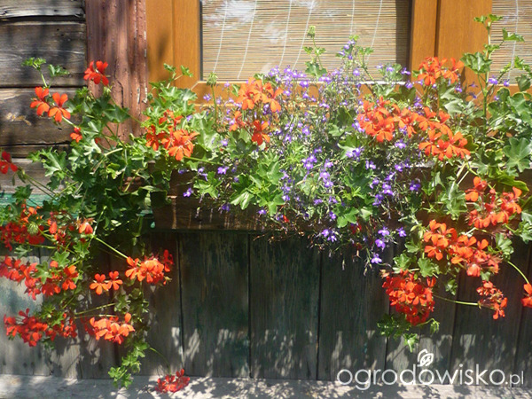 Okna sa od strony poołudniowej. Ściana garażu z pelargoniami kaskadowymi od półoncnego zachodu ego zachodu.