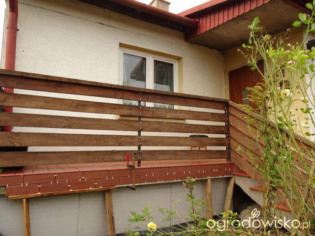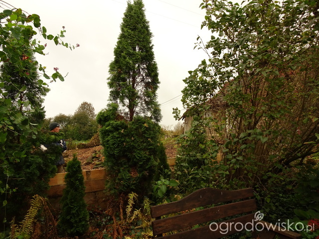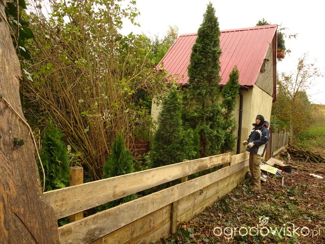 Od strony drewutni podnieśliśmy jeszcze o dwie deski celem zaznaczenia dla myśliwych, że to inna posesja jest i wstępu nie ma. Przy okazji widać nowe i stare tuje. Syn ma 190 cm wzrostu. Starsze tuje zostały zmasakrowane przy wycince orzecha bo konar do nas spadł.