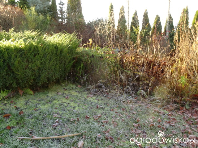 Przez ten kręgosłup Ema nie udało się jesienią całej nawłoci powyrywać z łąki, zostało przeszło połowa. Dziś połowę z tej połowy pozbawiliśmy nasion, może w tygodniu uda się resztę ogłowić. Trzy osoby z nożyczkami, a i tak zajęło to półtorej godziny. Kilka 20 litrowych wiaderek ubitych nasionami wywalone. Tylko jak widzę pół ha nawłoci zaraz za naszą siatką u sąsiada, to walkę z wiatrakami prowadzimy. Ogarnięta z suchego donica piwoniowa za tama i górne piętro w tamie. Pomocnika miałam. Szklarnia wymyta w środku i na zewnątrz, też mi długo zeszło. Zostało wyrwać chwasty i przekopać ziemię, ale to już innym razem. Swoją drogą skąd się w szklarni wzięły niezapominajki???