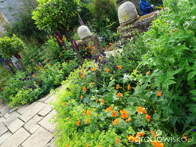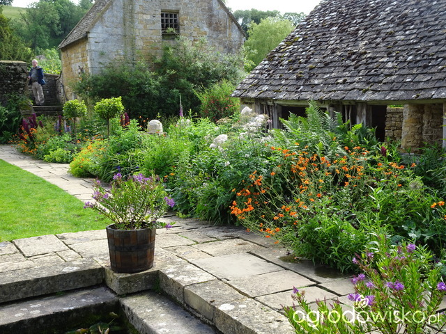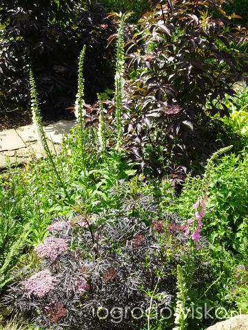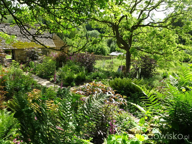 Przechodzimy do kolejnego pokoju ogrodowego. Kamienna ścieżka z obu stron otoczona jest przez rabaty, na których wśród bylin i paproci rosną różne odmiany bzów.
